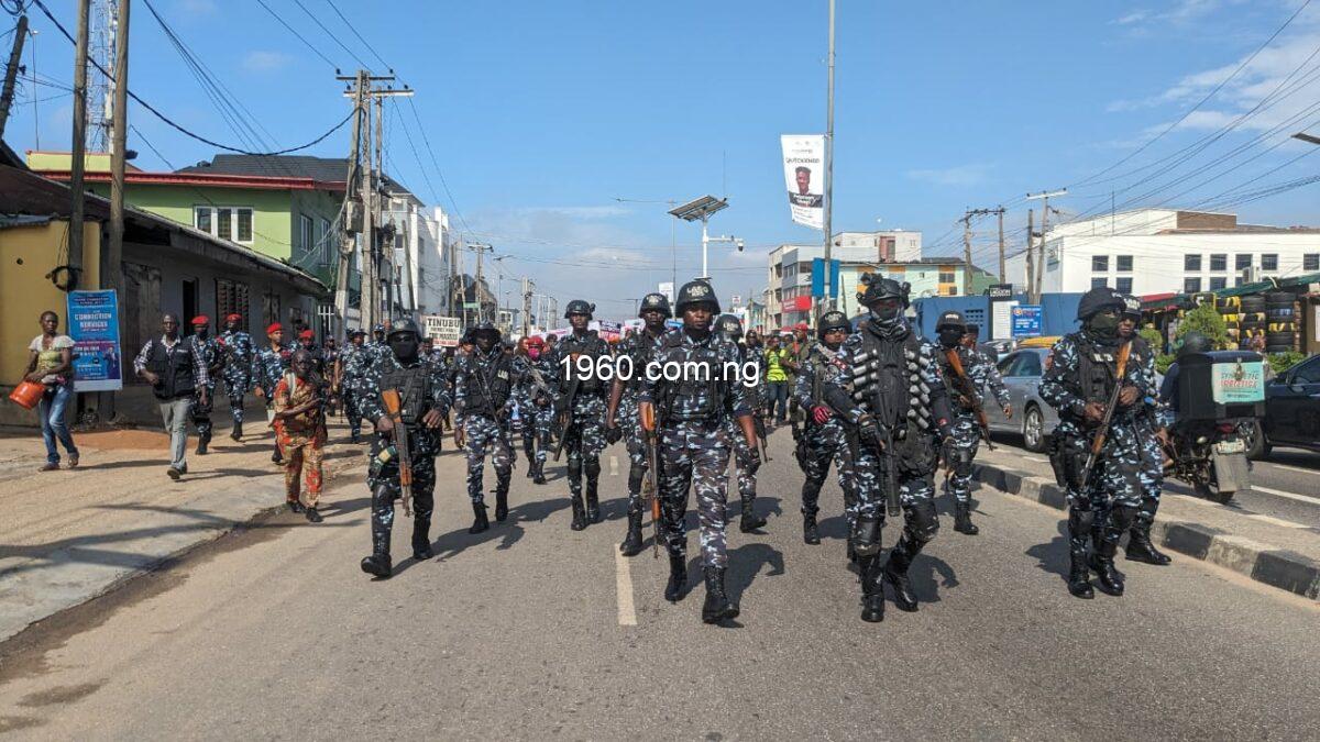 Our reporter observed that the police officers had no fewer than 24 teargas canisters, 10 teargas guns, 17 rifles and two pistols. There was also a heavy presence of officers of the Nigeria Security and Civil Defence Corps (NSCDC).