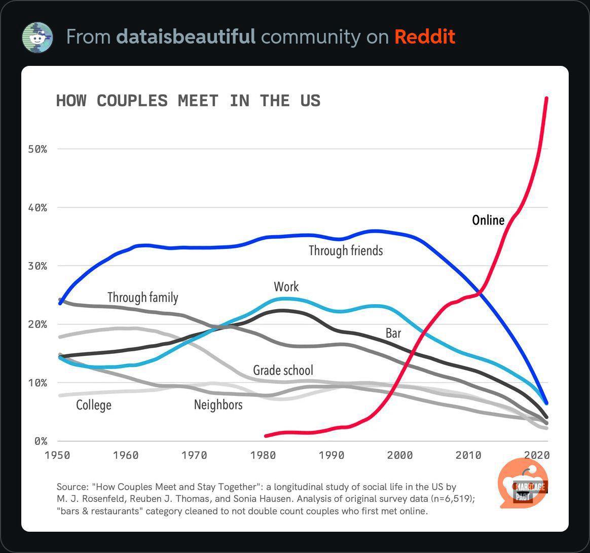 The internet revolutionized how couples met, with online dating becoming mainstream. Platforms like Match.com and later Tinder transformed the dating landscape, offering singles the chance to meet people across the globe. Social media also played a role, as friends-of-friends connections expanded beyond physical communities.